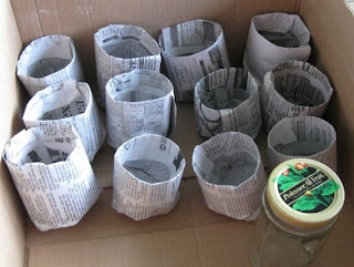 This site has a tutorial on making pots out of newspaper. I whipped these up in no time. I used a thin jelly jar. I may try to find something just a wee bit smaller for my next batch. The only downside was that my hands were black by the time I finished. It washed off easily enough, but this is not a project to do while you sit on a white couch.